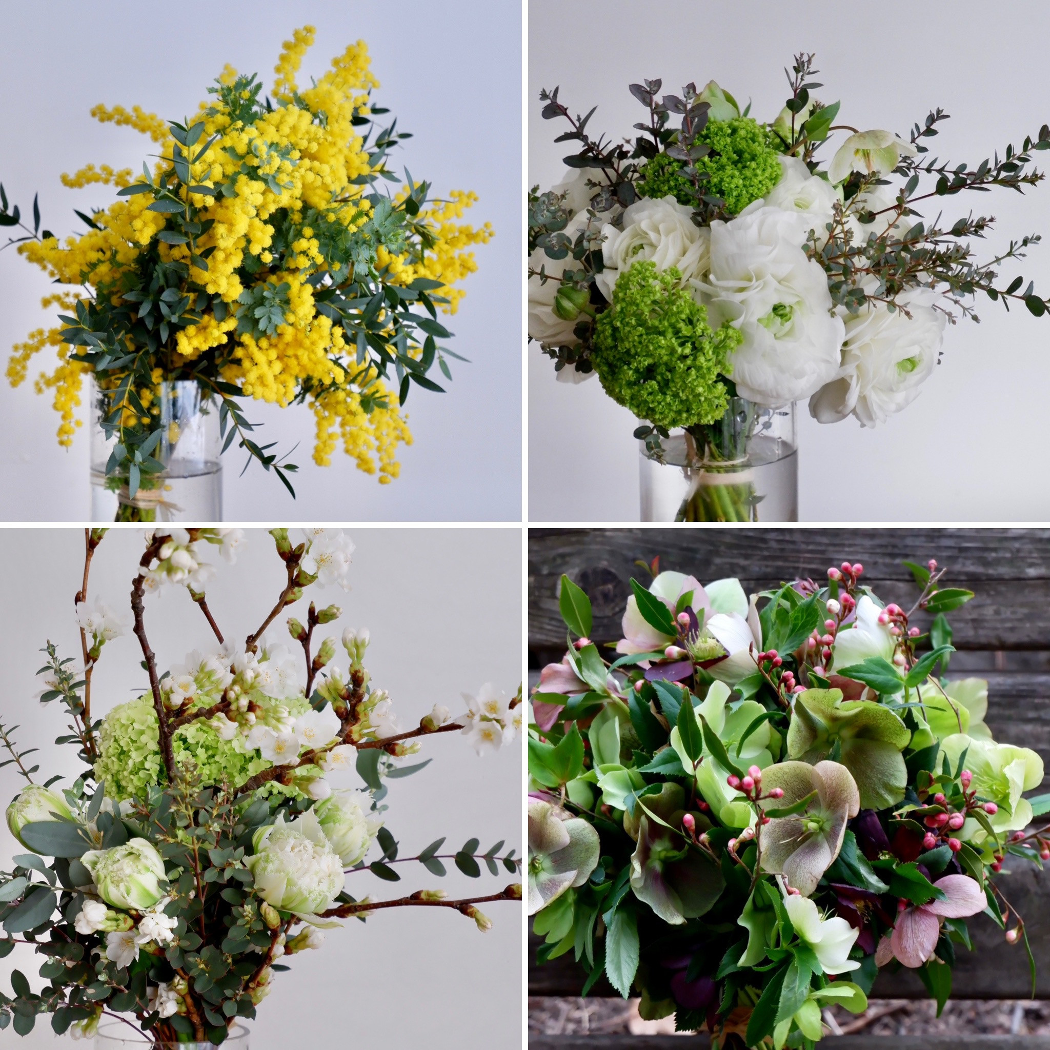 ミモザ(銀葉アカシア)、ラナンキュラスとスノーボール、