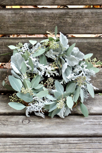 春に植えて程よく成長した2種類の白妙菊に、オーストラリアから届いたユーカリの蕾付き枝葉を、環状にしたサンキライの土台に絡めています。冬の始まりを思わせる美しい銀葉から冬支度のリースと名付けました。(2017.10コラムより抜粋)